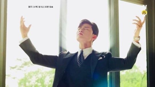 공개된 사진은 tvN 드라마 '김비서가 왜 그럴까'의 방송 장면으로, 사진 속 박서준은 양 손을 들고 포즈를 취하고 있다.
