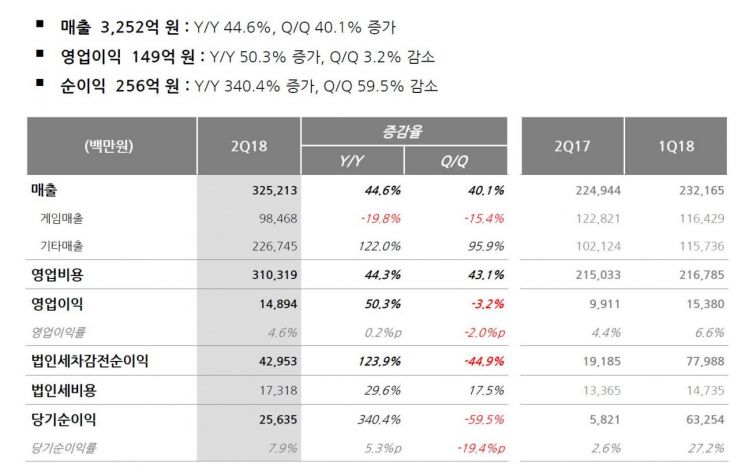게임 매출은 웹보드 게임의 계절적 비수기 영향과 일부 게임 매출이 자연 감소해 전년 동기 대비 19.8% 감소한 985억원을 기록했다. 게임 매출 중 모바일 게임의 비중은 58%, PC게임은 42%다. 지역별 매출은 개발법인 기준으로 국내 56%, 해외 44%다. 서비스 지역으로 구분하면 국내 44%, 해외 56%다.