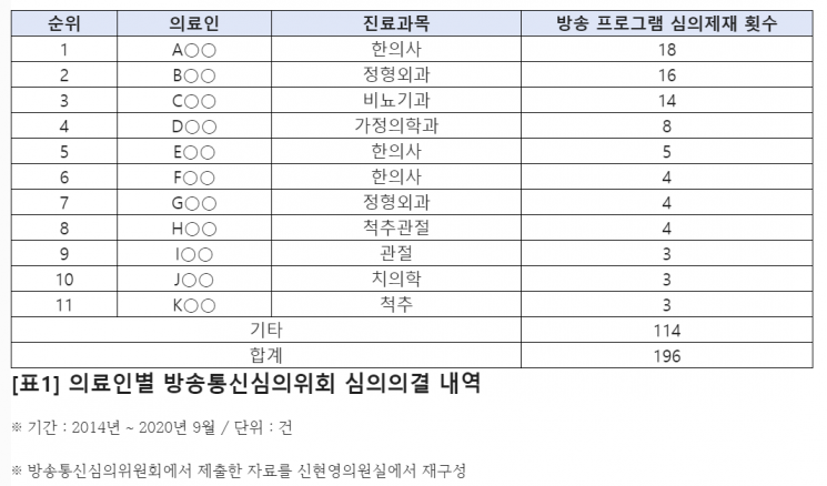 진료과목별로는 한의사가 54건(27.5%)으로 가장 많았고 정형외과 의사 27건(13.8%), 비뇨기과와 가정의학과 각 18건(9.2%) 순이었다. 담적병을 주제로 출연해 병원의 명칭을 반복적으로 고지한 한의사 A씨는 방송 프로그램 심의제재 횟수가 18회로 가장 많다.