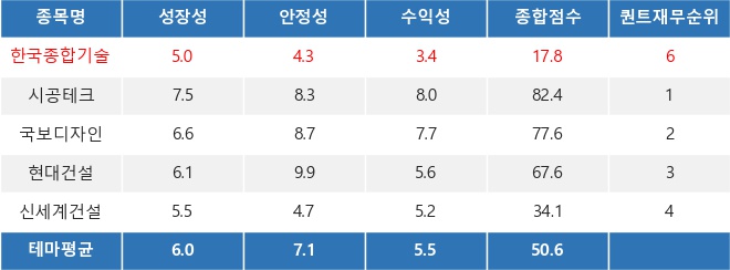 씽크풀 로보알고리즘 RASSI의 분석에 따르면, 한국종합기술 한국종합기술 close 증권정보 023350 KOSPI 현재가 5,330 전일대비 40 등락률 +0.76% 거래량 66,549 전일가 5,290 2026.04.21 15:30 기준 관련기사 [e 공시 눈에 띄네] 코스피-25일 [e공시 눈에 띄네] 코스피-26일 한국종합기술, 테마파크 테마 상승세에 3.72% ↑ 의 퀀트 재무 점수는 17.8점으로 테마파크 관련 다른 종목 평균 보다 안정성과 수익성, 성장성 점수가 모두 낮은 편이다. 이는 재무적 측면에서 한국종합기술 한국종합기술 close 증권정보 023350 KOSPI 현재가 5,330 전일대비 40 등락률 +0.76% 거래량 66,549 전일가 5,290 2026.04.21 15:30 기준 관련기사 [e 공시 눈에 띄네] 코스피-25일 [e공시 눈에 띄네] 코스피-26일 한국종합기술, 테마파크 테마 상승세에 3.72% ↑ 이 다른 종목 대비 투자 매력도가 그다지 높지 않다는 것으로 해석될 수 있다. 반면에 시공테크는 다른 종목 평균 대비 높은 성장성과 안정성, 수익성 점수로 퀀트 재무 순위 1위를 차지했다.
