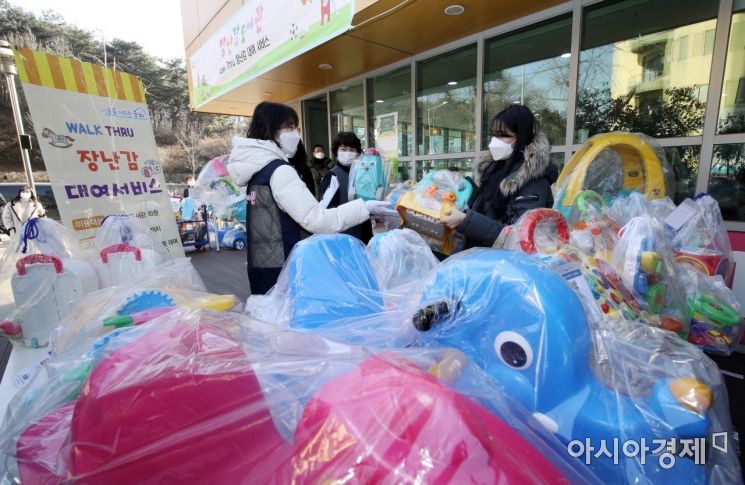 20일 서울 송파구 오금동 송파구육아종합지원센터에서 시민들이 장난감 대여서비스를 이용하고 있다. 송파구는 코로나19 장기화에 따른 '워크 스루'(보행) 장난감 대여 서비스를 운영한다. 인터넷으로 예약 신청한 뒤 찾아가면 되고, 송파구 장난감도서관 회원이면 한 번에 2개까지 빌릴 수 있다./김현민 기자 kimhyun81@