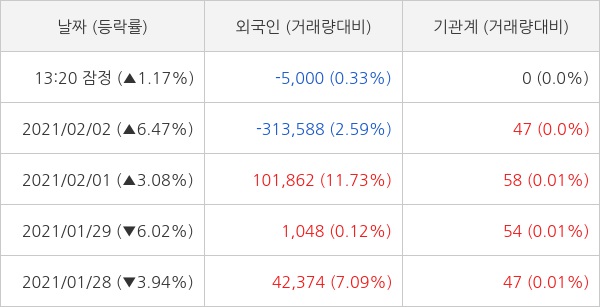 오늘 외국인은 5000주 순매도 하는 것으로 잠정 집계되고 있다. 최근 5일 동안 개인 투자자들은 16만 5887주 순매수 했고, 외국인과 기관은 각각 15만 9649주 순매도, 250주 순매수 했다.