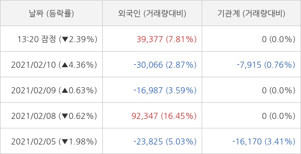 오늘 외국인은 3만 9377주 순매수 하는 것으로 잠정 집계되고 있다. 최근 5일 동안 개인 투자자들은 3만 2661주 순매도 했고, 외국인과 기관은 각각 5만 9849주 순매수, 2만 4085주 순매도 했다.