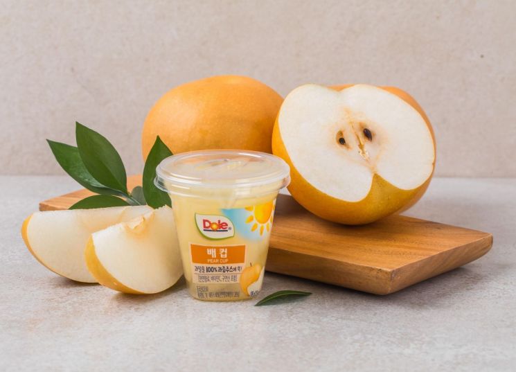 '배 컵'은 돌 코리아의 ‘후룻컵’ 라인의 신제품이다. ‘배 컵’은 고당도의 배를 한 입에 먹기 좋은 크기로 자르고 100% 과즙 주스와 함께 담아 과일과 주스를 한번에 즐길 수 있다. 이번 제품은 한 손에 잡히는 크기(198g)에 포크도 동봉돼 있다. 가격은 편의점 기준 2500원이다.