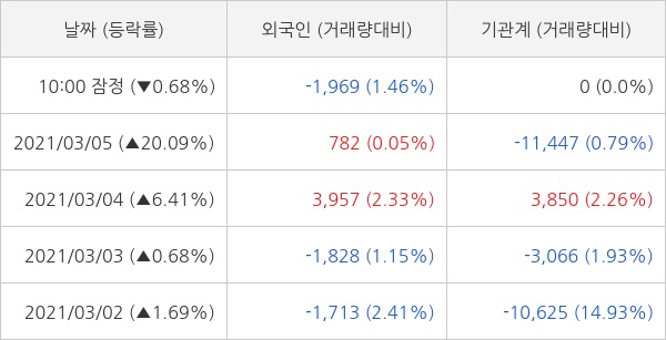 오늘 외국인은 1969주 순매도 하는 것으로 잠정 집계되고 있다. 최근 5일 동안 개인 투자자들은 2만 5198주 순매수 했고, 외국인과 기관은 각각 2618주 순매수, 2만 2885주 순매도 했다.