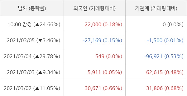 오늘 외국인은 2만 2000주 순매수 하는 것으로 잠정 집계되고 있다. 최근 5일 동안 개인 투자자들은 13만 5178주 순매수 했고, 외국인과 기관은 각각 12만 5284주 순매도, 8201주 순매도 했다.