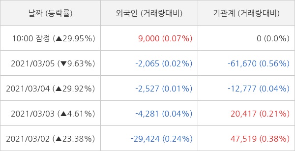 오늘 외국인은 9000주 순매수 하는 것으로 잠정 집계되고 있다. 최근 5일 동안 개인 투자자들은 23만 2462주 순매수 했고, 외국인과 기관은 각각 19만 7818주 순매도, 6382주 순매도 했다.