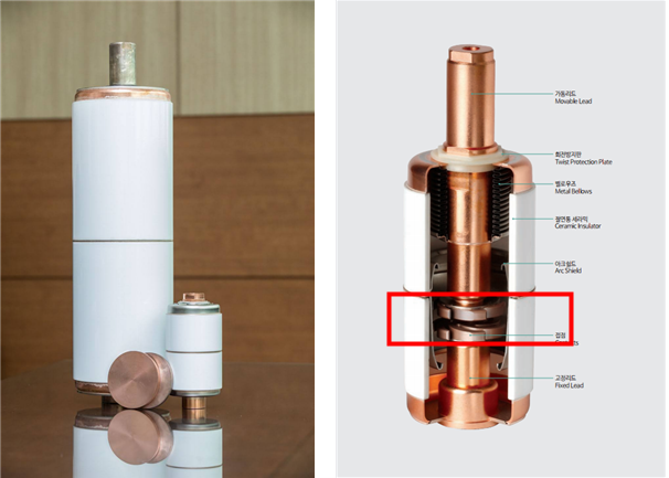 자료사진1] 생기원과 비츠로이엠이 공동 개발한 진공 인터럽터(뒤)와 국산화에 성공한 접점 소재(앞) [자료사진2] 접점은 아크 발생 시 개페를 통해 전력을 차단하는 역할을 한다. (진공 인터럽터 내부 모습)