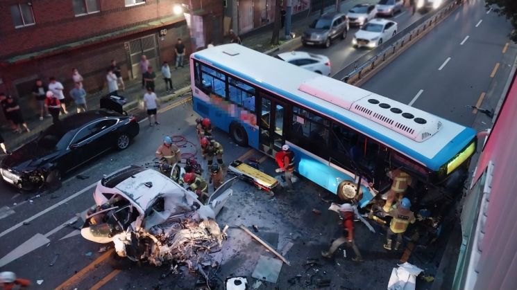 50대 버스 운전자와 승객 3명, 50대 승용차 운전자와 동승자 2명은 머리와 가슴 등에 경상을 입었다.