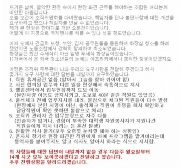 공지에는 “뜨거운 날씨, 열악한 환경 속에서 현장 파견 근무를 해야 하는 조합원 여러분께 미안한 마음”이라며 “조직위원회 책임자를 만나 불편 사항에 대한 개선을 요구하려고 했으나 책임자를 만날 수 없었다. 제가 본 현장은 한마디로 개판 오 분 전이었다. 어떻게 이 지경으로 국제행사를 치를 수 있나 싶을 정도”라고 적혀 있었다.