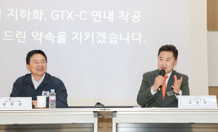 지역에 광역교통망을 확충하고, 이 과정의 노력을 홍보하기 위한 지자체장의 발걸음이 더 바빠졌다. 사진은 지난 5월 창동아우르네에서 열린 ‘GTX-C 창동역 주민간담회’에서 원희룡 국토교통부 장관과 오언석 도봉구청장(사진 오른쪽)이 인사말을 하는 모습.(사진=도봉구 제공)