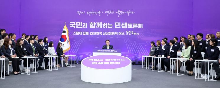 윤석열 대통령이 25일 경기도 용인특례시청에서 '대한민국 신성장동력 허브, 용인특례시'를 주제로 열린 스물세 번째 국민과 함께하는 민생토론회에서 발언하고 있다. [이미지출처=연합뉴스]