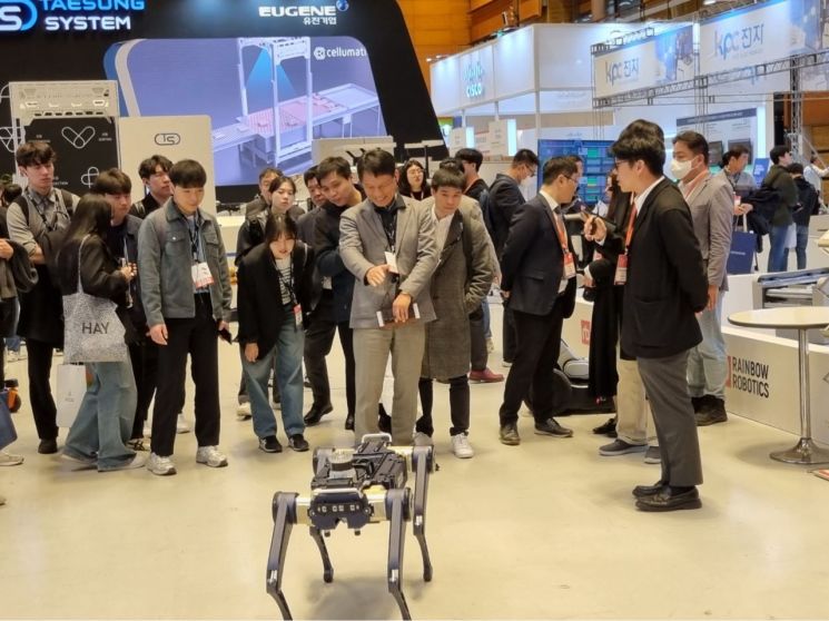 이상훈 한국산업단지공단 이사장(사진 앞줄 가운데)과 직원들이 29일 삼성동 코엑스에서 개최된 2024 스마트공장·자동화 산업전을 관람하며 디지털 기술 발전 방향을 확인하고 있다.