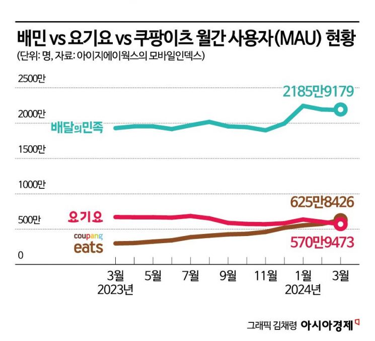 6일 데이터 기업 아이지에이웍스는 모바일인덱스로 집계해보니 지난달 배민과 요기요, 쿠팡이츠 사용자 수(MAU)는 각각 2186만 명, 571만 명, 626만 명을 기록했다고 밝혔다. 전월과 비교하면 배민은 0.3% 감소로 큰 변화가 없다. 하지만 요기요는 5.3% 줄었고 쿠팡이츠는 9.0% 증가했다. 그러면서 쿠팡이츠는 월간 사용자 기준으로는 2019년 6월 출시 이후 처음으로 요기요를 제치고 2위로 올라섰다.