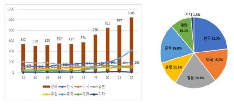 다만 2013년~2022년 연평균 증가율에선 중국(37.5%·1위), 유럽연합(10.0%·2위), 대만(9.9%·3위), 한국(4.4%·4위), 미국(4.1%·5위) 순으로 집계됐다.