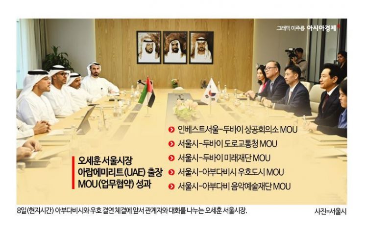 아랍에미리트(UAE) 출장에 나선 오세훈 서울시장이 현지에서 총 5건의 MOU(업무협약)를 끌어냈다. 실효성 높은 경제 교류를 위한 방안으로, 투자유치 외 미래 모빌리티와 문화 등 분야도 다양하다. 이를 기반으로 서울시의 중동 내 경쟁력을 확대하고 글로벌 시장으로의 진출에도 속도를 내겠다는 방침이다.