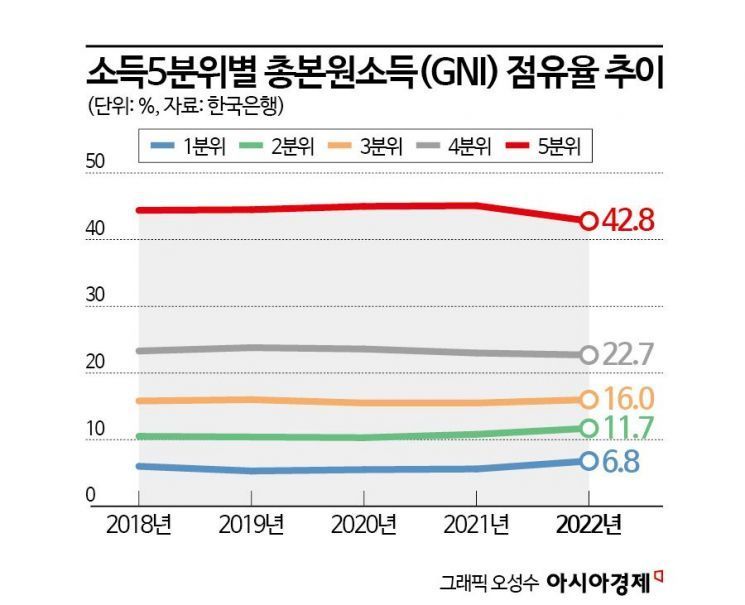 소득분위를 5개로 나눴을 때 가장 높은 구간인 5분위 구간의 총본원소득(GNI) 점유율은 2020년 45%에서 2022년 42.8%까지 하락했다. 4분위는 23.6%에서 22.7%까지 하락했다.