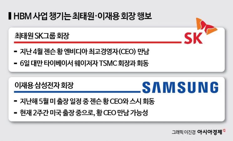 고대역폭메모리(HBM) 사업 확대가 절실한 삼성전자도 제품 공급을 위해 미국 출장 중인 이재용 삼성전자 회장이 직접 나설 수 있다는 전망이 나오면서 국내 반도체 업체 총수 간 경쟁도 본격화하는 양상이다.