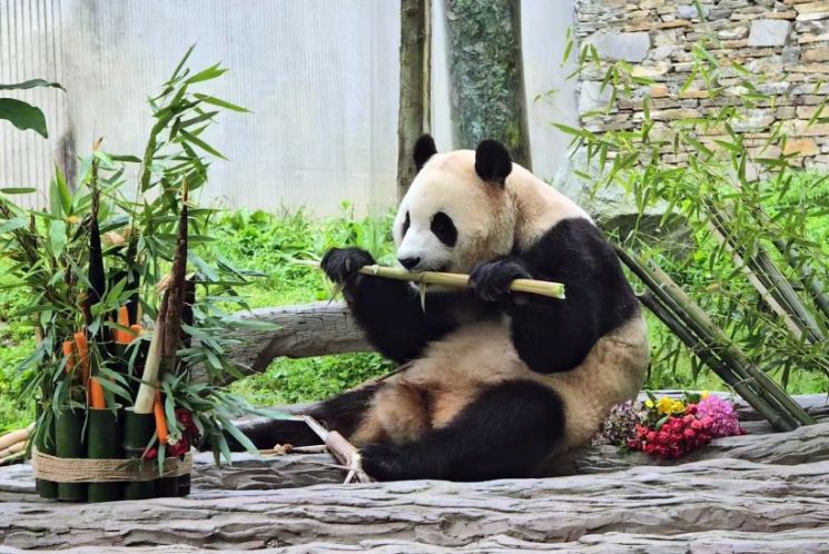 지난 4월 중국으로 돌아간 자이언트판다 '푸바오'가 2개월여 만인 12일 대중 앞에 모습을 드러냈다. 사진은 선물받은 죽순케이크를 먹는 푸바오. [이미지출처=연합뉴스]