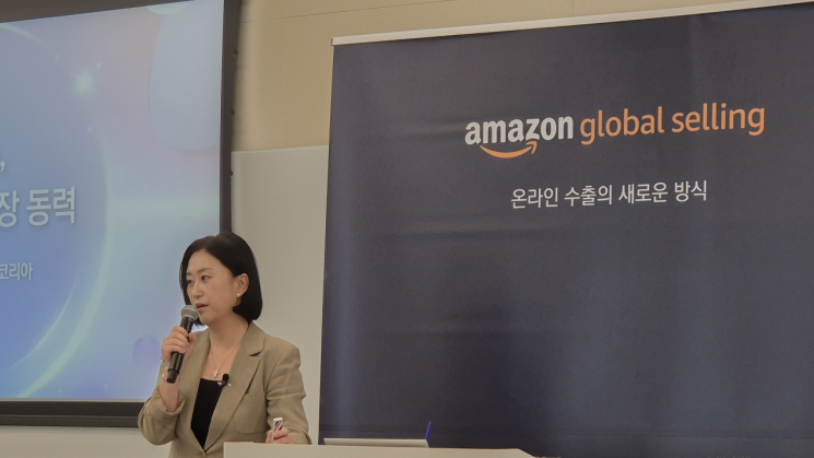 울시 강남구 센터필드 빌딩에서 열린 아마존 글로벌 셀링 코리아 '프로젝트 K-뷰티 고 빅' 미디어 간담회에서 신화숙 아마존 글로벌셀링 코리아 대표가 이야기를 하고 있다. [사진=이민지 기자]