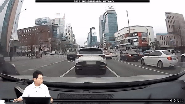 영상을 제보한 운전자 A씨는 당시 교차로에서 좌회전 신호를 받고 좌회전을 하려던 중이었다고 설명했다. 그때 신호가 황색으로 바뀌었고 그냥 가려던 앞차가 갑자기 멈춰서면서 A씨가 후방을 충돌했다. A씨에 따르면 사고는 경미해 살짝 흔들릴 정도의 추돌이었다.