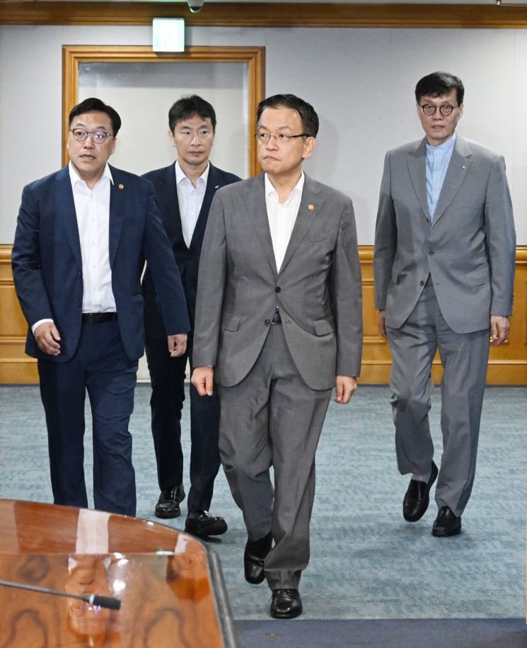 금융당국 수장들이 한국의 거시경제에 대해 논의하는 거시경제 금융회의가 1일 서울 은행회관에서 열렸다. 최상목 경제부총리 겸 기획재정부 장관이 모두발언을 하고 있다. 왼쪽부터 이복현 금융감독원장, 이창용 한국은행 총재, 최 부총리, 김병환 신임 금융위원장. 사진=허영한 기자 younghan@