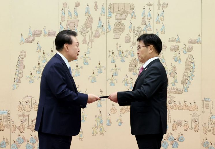 윤석열 대통령이 19일 서울 용산 대통령실 청사에서 열린 장관 임명장 수여식에서 유상임 과학기술정보통신부 장관에게 임명장을 수여하고 있다. [이미지출처=연합뉴스]
