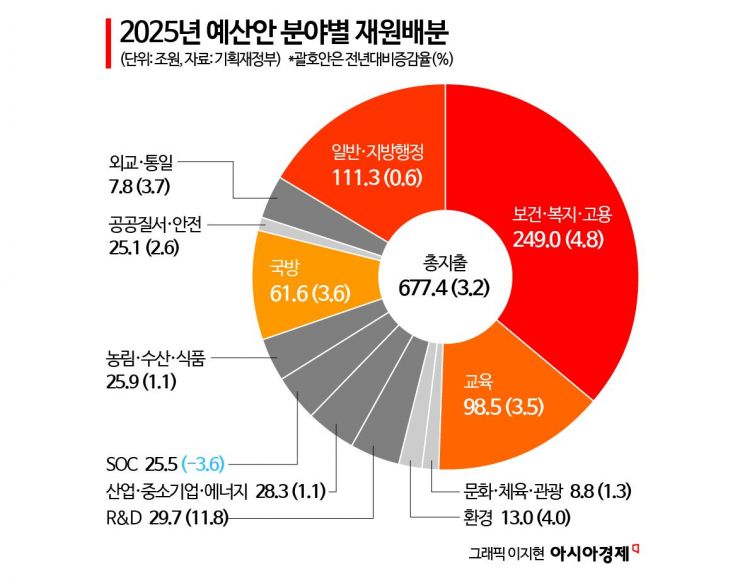 윤석열 정부가 임기 4년 차인 내년도 예산을 올해(656조6000억원)보다 3.2% 늘어난 677조4000억원으로 편성했다. 사회간접자본(SOC) 분야를 제외한 연구개발(R&D), 보건·복지·고용, 교육, 환경, 외교통일 등 11개 분야 모두에서 예산이 늘었다.