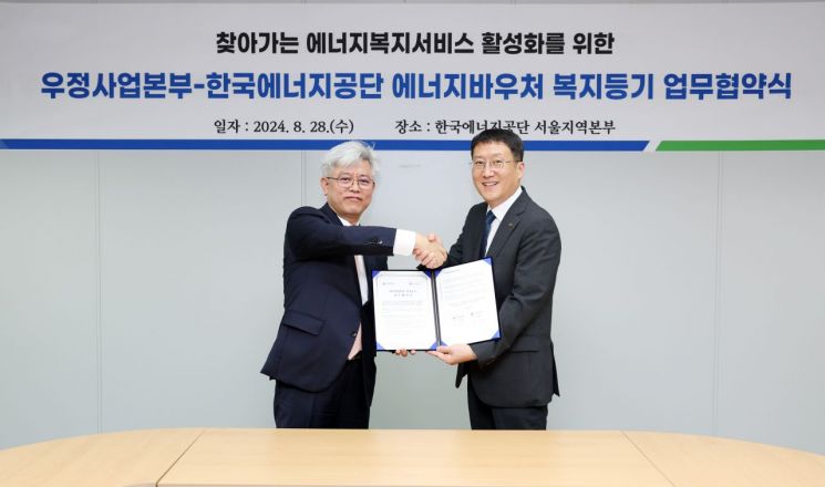 한국에너지공단은 찾아가는 에너지복지서비스 활성화를 위해 우정사업본부와 '에너지바우처 복지등기' 업무협약을 28일 체결했다.