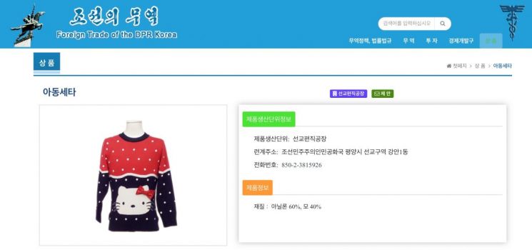 29일 '조선의 무역' 홈페이지를 보면, 경공업 항목에서 일본 산리오사의 '헬로키티' 캐릭터가 그려진 아동복 등 의류들이 판매되고 있다. 조선의 무역은 북한의 공식 무역·투자 전용 사이트다. 선교편직공장에서 생산했다는 아동세타(아동 스웨터) 제품을 보면 아닐론(아크릴 섬유를 뜻하는 북한말) 60%에 모 40%가 함유됐다는 정보도 함께 기재돼 있다.