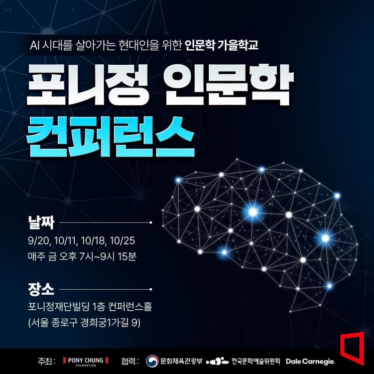 행사는 20일부터 다음달 25일까지, 매주 금요일 저녁 7시 서울 종로구 포니정재단빌딩 1층 컨퍼런스홀에서 열린다. 아울러 오는 20일부터 22일까지 문화체육관광부가 주최하고 한국문화예술위원회가 주관하는 '제1회 인문문화축제'와 연계해 프로그램을 운영한다.