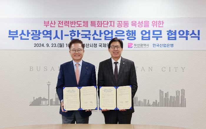 한국산업은행과 부산광역시는 23일 부산시청에서 강석훈 산업은행 회장, 박형준 부산시장이 참석한 가운데 '부산 전력반도체 소부장 특화단지 공동 육성'을 위한 업무협약(MOU)을 체결했다.