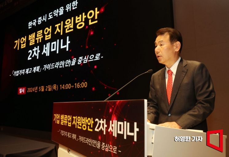 한국증시 도약을 위한 기업 밸류업 지원방안 2차 세미나가 2일 한국거래소에서 열렸다. 정은보 한국거래소 이사장이 인사말을 하고 있다. 사진=허영한 기자 younghan@