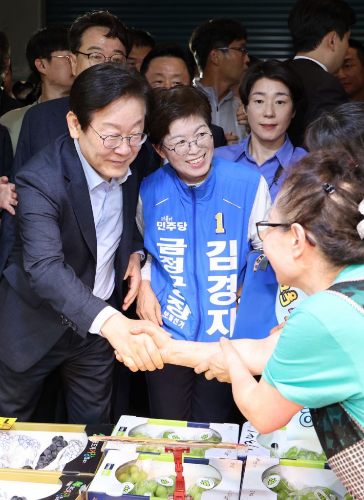 10·16 금정구청장 보궐 선거를 앞두고 24일 오후 부산 금정구 서동미로시장에서 이재명 더불어민주당 대표와 김경지 금정구청장 후보자가 상인 및 시민 등과 인사하며 지지를 호소하고 있다. [이미지출처=연합뉴스]