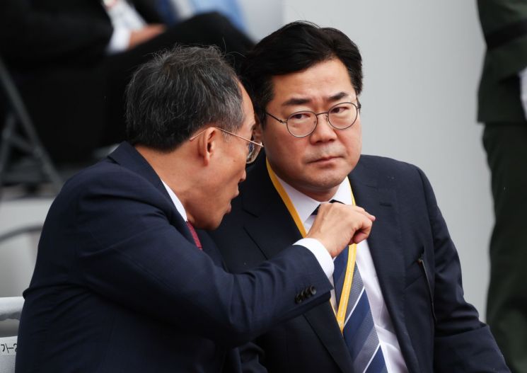 국민의힘 한동훈 대표(왼쪽)가 1일 성남 서울공항에서 열린 건군 76주년 국군의날 기념식에 참석해 박찬대 더불어민주당 원내대표와 인사하고 있다. 가운데는 주호영 국회부의장. [이미지출처=연합뉴스]