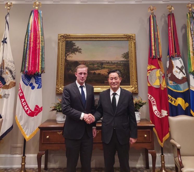 신원식 국가안보실장(오른쪽)과 미국 제이크 설리번 국가안보보좌관이 25일(현지시간) 미국 워싱턴DC에서 만나 한미 관계 및 북한 문제 등을 논의했다고 대통령실이 전했다. [이미지출처=연합뉴스]