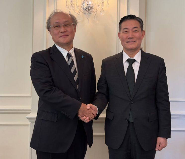 신원식 국가안보실장(오른쪽)과 일본 아키바 다케오 국가안전보장국장이 25일(현지시간) 미국 워싱턴DC에서 만나 한일관계 및 북한 문제 등을 논의했다고 대통령실이 전했다. [이미지출처=연합뉴스]