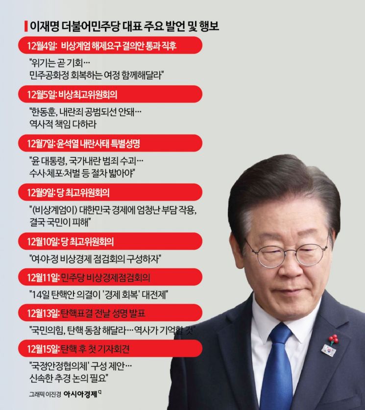 이 대표가 윤 대통령 탄핵 직후 수권정당 대표로서의 면모를 공개적으로 드러낸 건 15일 국회 기자회견에서다. 그는 이 자리에서 "국회와 정부가 함께하는 초당적 '국정안정협의체' 구성을 제안한다"며 "민주당은 모든 정당과 함께 국정 안정과 국제신뢰 회복을 위해 적극 협력하겠다"고 말했다. 국회라고 표현했지만, 민주당이 중심이 돼 정부와 함께 비상계엄 및 탄핵 정국 사태를 수습하겠다는 뜻을 밝혔다.