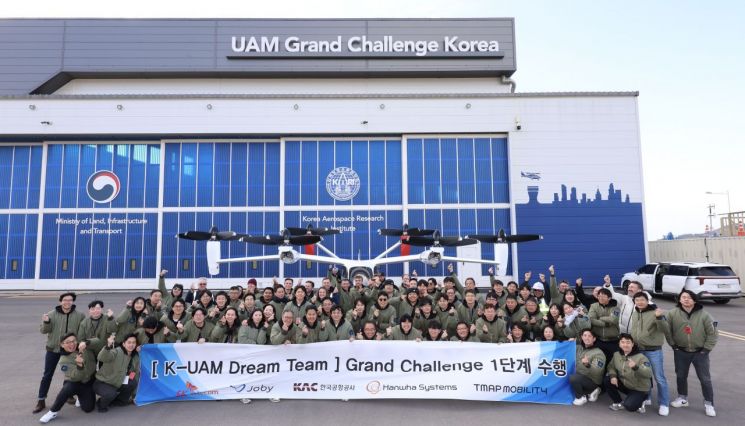 한국공항공사, SK텔레콤, 한화시스템, 미국 조비(Joby)의 임직원들이 15일 전남 고흥에서 국가종합비행성능시험장에서 'K-UAM 그랜드챌린지' 1단계 실증을 마치고 기념촬영을 하고 있다. 제공 한국공항공사