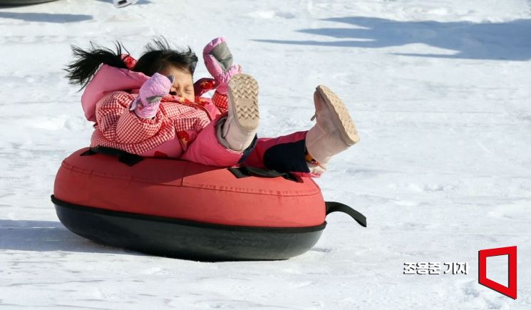 한강공원 눈썰매장 개장 첫날인 24일 서울 뚝섬 한강공원 눈썰매장을 찾은 한 아이가 눈썰매를 즐기고 있다. 서울시는 이날부터 뚝섬, 잠원, 여의도 한강공원 눈썰매장을 개장해 내년 2월 16일까지 휴무 없이 오전 9시부터 오후 5시까지 운영한다.