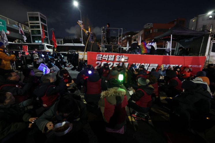 윤석열 대통령에 대한 공수처의 체포영장 집행이 불발된 3일 오후 서울 용산구 대통령 관저 인근에서 민주노총 조합원들이 체포·탄핵 찬성 집회를 하고 있다. 연합뉴스 제공
