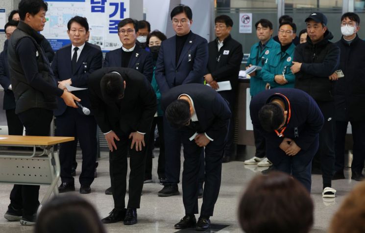 애경그룹 지주사 AK홀딩스 고준 대표가 4일 오후 무안국제공항에서 지난 12월 31일 애경그룹의 한 계열사에서 진행한 연말 행사와 관련해 유가족들에게 사과하고 있다. 연합뉴스