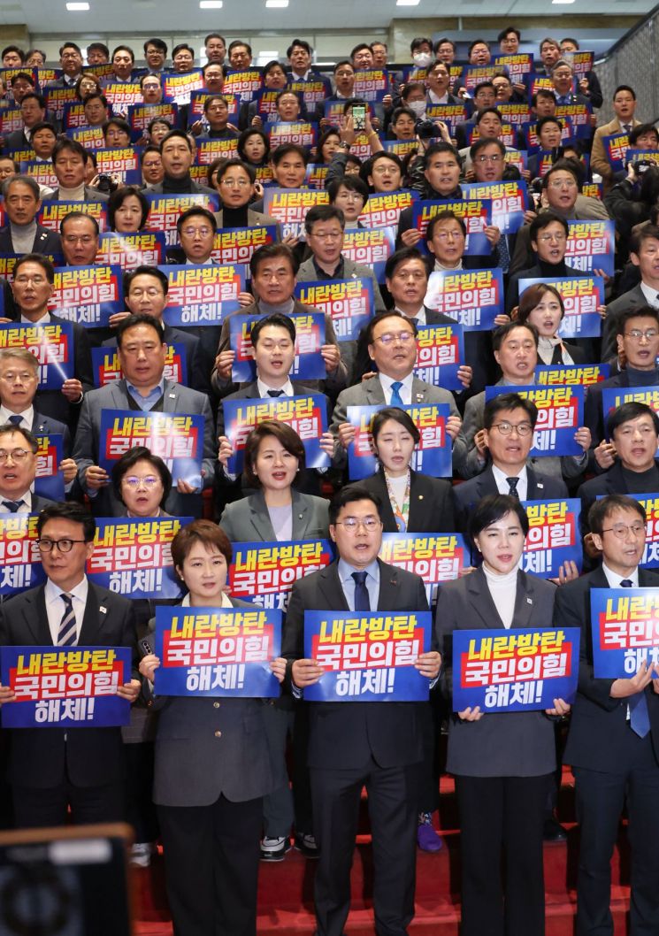 규탄대회에서 민주당 의원들은 국민의힘을 '내란 동조 정당' '위헌 정당' '헌법의 적' '국민의 짐' 등으로 비판했다. 이들은 세 차례 구호를 외치며 "'내란 수괴' 윤석열을 즉각 체포하라"고 강조했다.