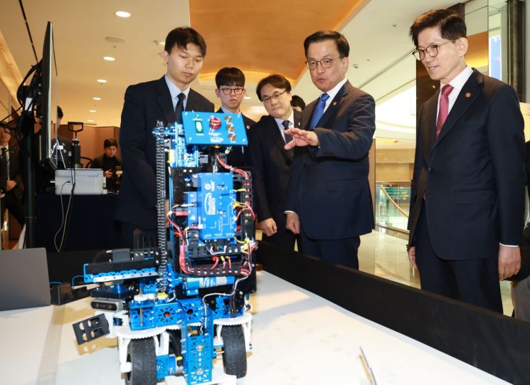 (오른쪽부터) 김문수 고용노동부 장관과 최상목 대통령 권한대행 부총리 겸 기획재정부 장관이 13일 서울 송파구 잠실 롯데호텔 월드에서 열린 '47회 프랑스 리옹 국제기능올림픽 선수단 격려 오찬'에 참석해 모바일로보틱스 부문 금메달을 획득한 수상작을 살펴보고 있다. 연합뉴스