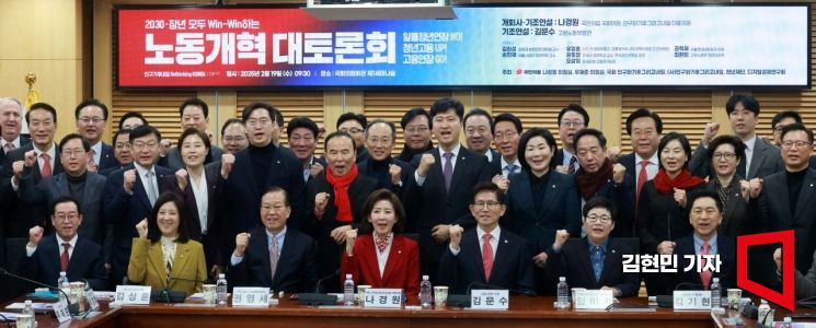 권영세 국민의힘 비상대책위원장과 김문수 고용노동부 장관과 등 참석자들이 19일 국회 의원회관에서 열린 '2030·장년 모두 Win-Win하는 노동개혁 대토론회'에서 기념촬영을 하고 있다. 2025.2.19 김현민 기자