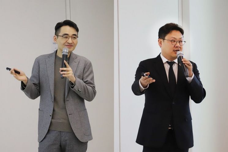 염승환 LS증권 이사(왼쪽)와 최광혁 리서치센터장이 18일 서울 여의도 LS증권 본사에서 열린 리테일 고객 대상 투자 세미나에서 강연하고 있다. LS증권 제공