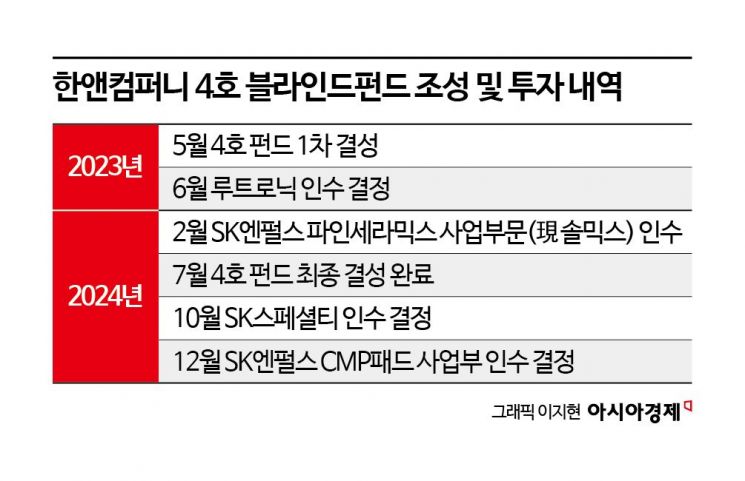 27일 투자은행(IB) 업계에 따르면 한앤코는 지난해 7월께 결성한 4조 7000억원 규모 4호 블라인드펀드 중 2조원 가량을 소진한 것으로 전해졌다. 이 펀드는 한국 투자 전용 펀드로는 역대 최대 규모다. 2023년 5월 1차 결성 직후 루트로닉 인수를 결정한 이후 지난해 2월 SK엔펄스 파인세라믹스 사업부문(현 솔믹스)도 인수했다. 지난해 7월 펀드 최종 결성 이후에도 같은 해 10월과 12월 SK스페셜티와 SK엔펄스 CMP패드 사업부 인수를 결정하고 진행 중이다. 통상 사모펀드 운용사들은 펀드를 조성 중에도 투자를 진행한다. 그럼에도 최근 마땅한 매물이 없다는 M&A 시장 분위기와 다르게 한발 먼저 움직였다는 평가다.