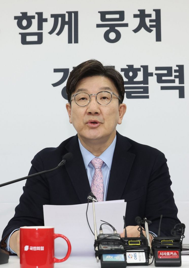 권 원내대표는 오는 24일 이뤄질 한덕수 국무총리의 탄핵심판 선고와 관련, "헌재는 (대통령) 권한대행의 (탄핵소추) 의결정족수가 151석인가, 200석인가에 대한 명확한 판단을 내려야 한다"며 "이 문제를 회피한다면 거대 야당에 무제한 탄핵면허증을 부여하는 것"이라고 강조했다.