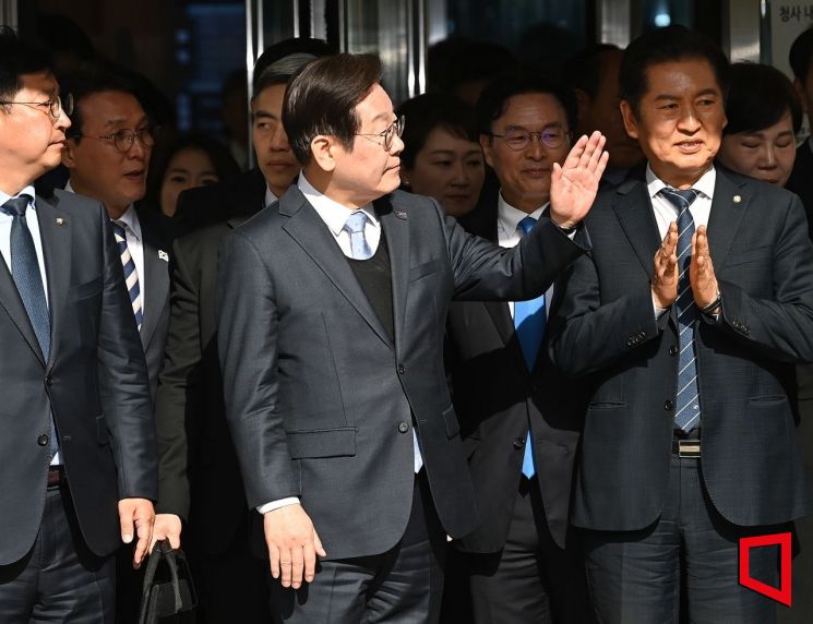 공직선거법 위반 항소심에서 무죄를 선고받은 이재명 더불어민주당 대표가 26일 서울 서초구 서울고등법원에서 열린 공직선거법 위반 혐의 2심 선고 공판을 마친 뒤 지지자들을 향해 인사를 하고 있다. 2025.3.26 사진공동취재단