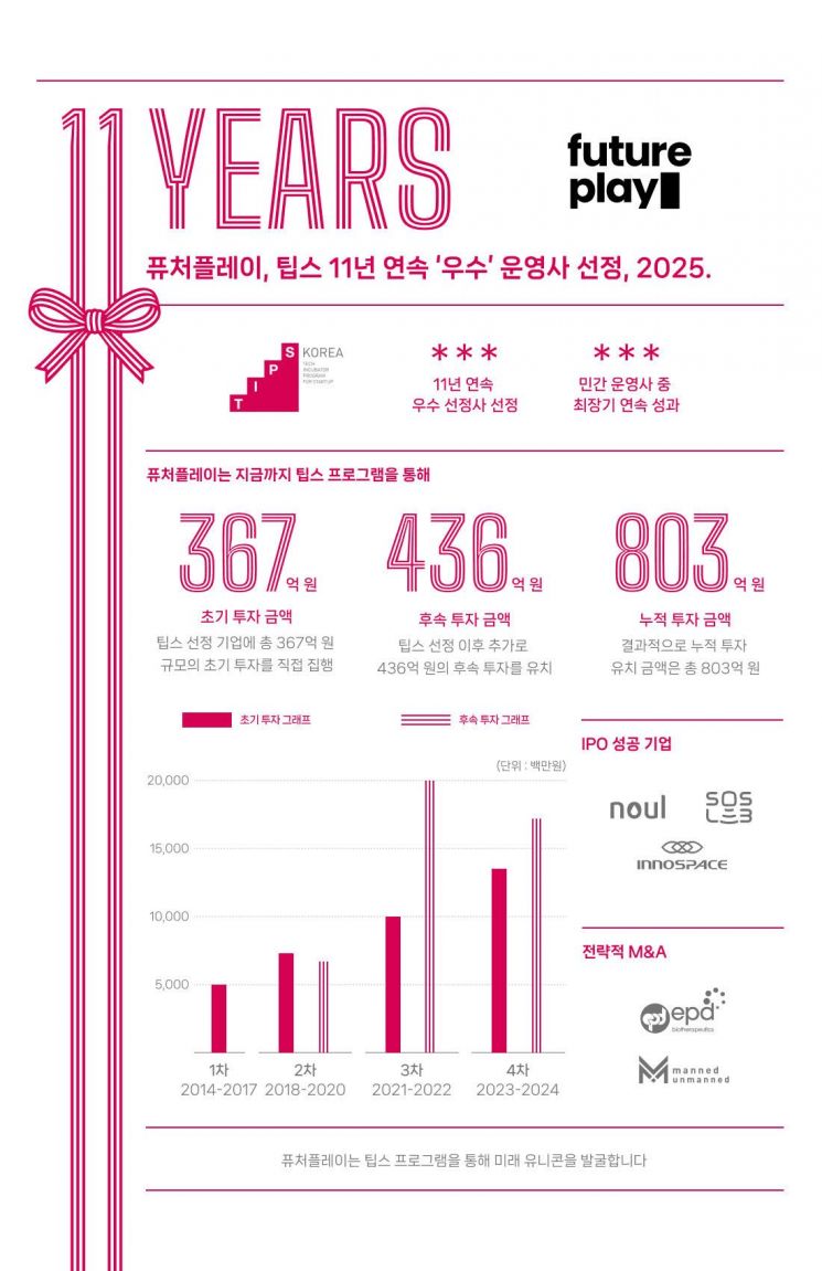 퓨처플레이가 21일 "민간주도 기술창업 지원 프로그램 '팁스(TIPS)'의 운영사로서 11년 연속 우수 평가를 받으며 기술창업 생태계에서 독보적인 성과를 입증했다"고 밝혔다.